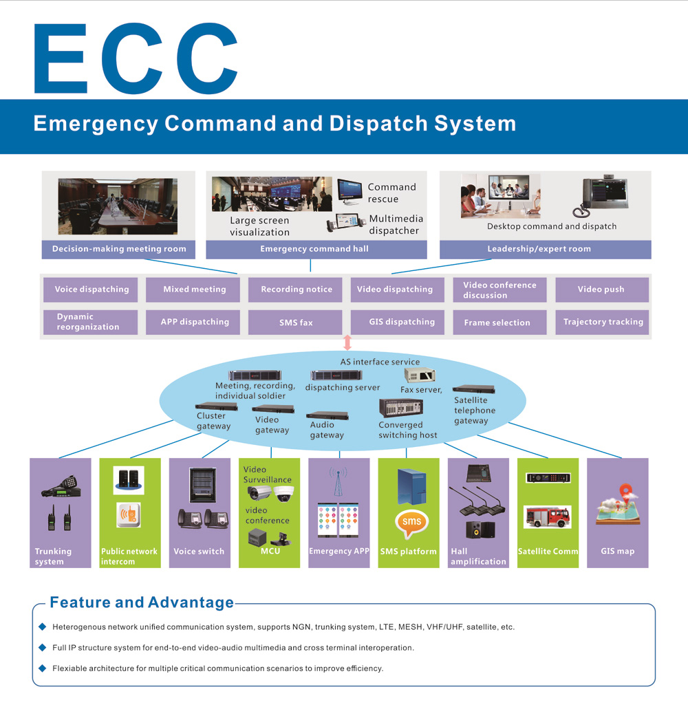 El comando y el sistema de despacho de emergencia es un comando de comunicación integrado y un sistema de programación basado en la red IP para realizar la voz, el video, los datos y la información de la información multimedia. Conecta diferentes tipos de medios de comunicación y terminales a una plataforma de comunicación unificada para lograr la interconexión, proporcionando la capacidad de la plataforma del despacho de comunicación y los medios de comando para el comando de emergencia y el rescate.